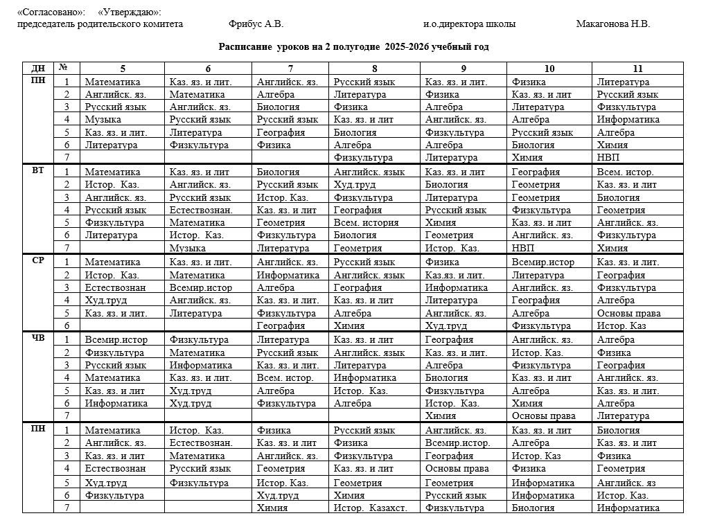 2025-2026 оқу жылының екінші жартыжылдығына арналған сабақ кестесі