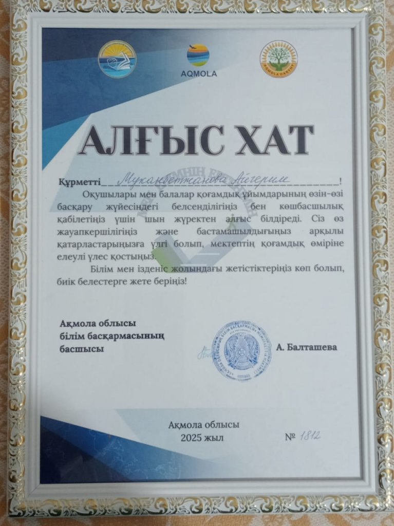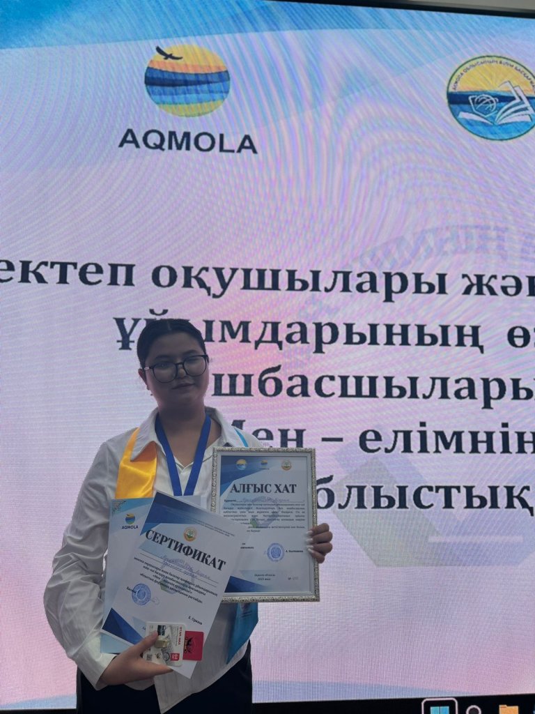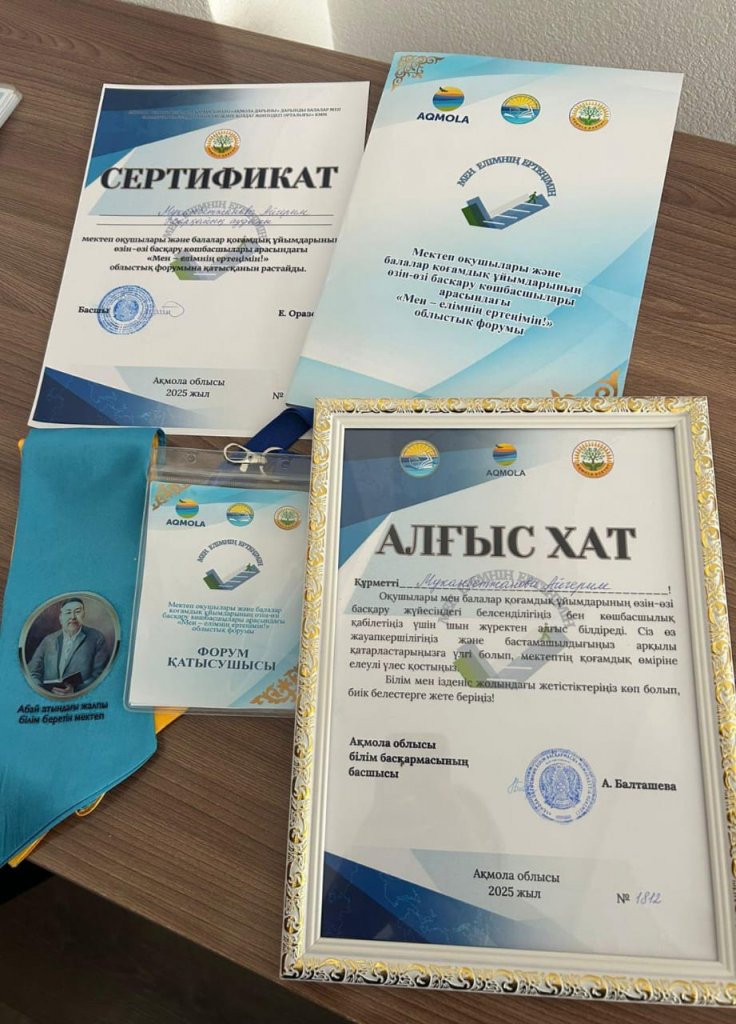 20–21 қараша күндері Сандықтау ауылындағы "Жас Дәурен" лагері базасында мектеп парламенті көшбасшыларының қатысуымен "Мен – елімнің ертеңімін" тақырыбындағы облыстық форум өтті. Аталған форумға мектеп парламентінің әр фракциясының жұмысын қамтыған портфолионы қорғаған 10-сынып оқушысы Муканбетжанова Айгерим қатысты. Форумға белсенді қатысқаны үшін Айгерим Ақмола облысы Білім беру басқармасының басшысы А.К.Балташева тарапынан Алғыс хатпен марапатталды.